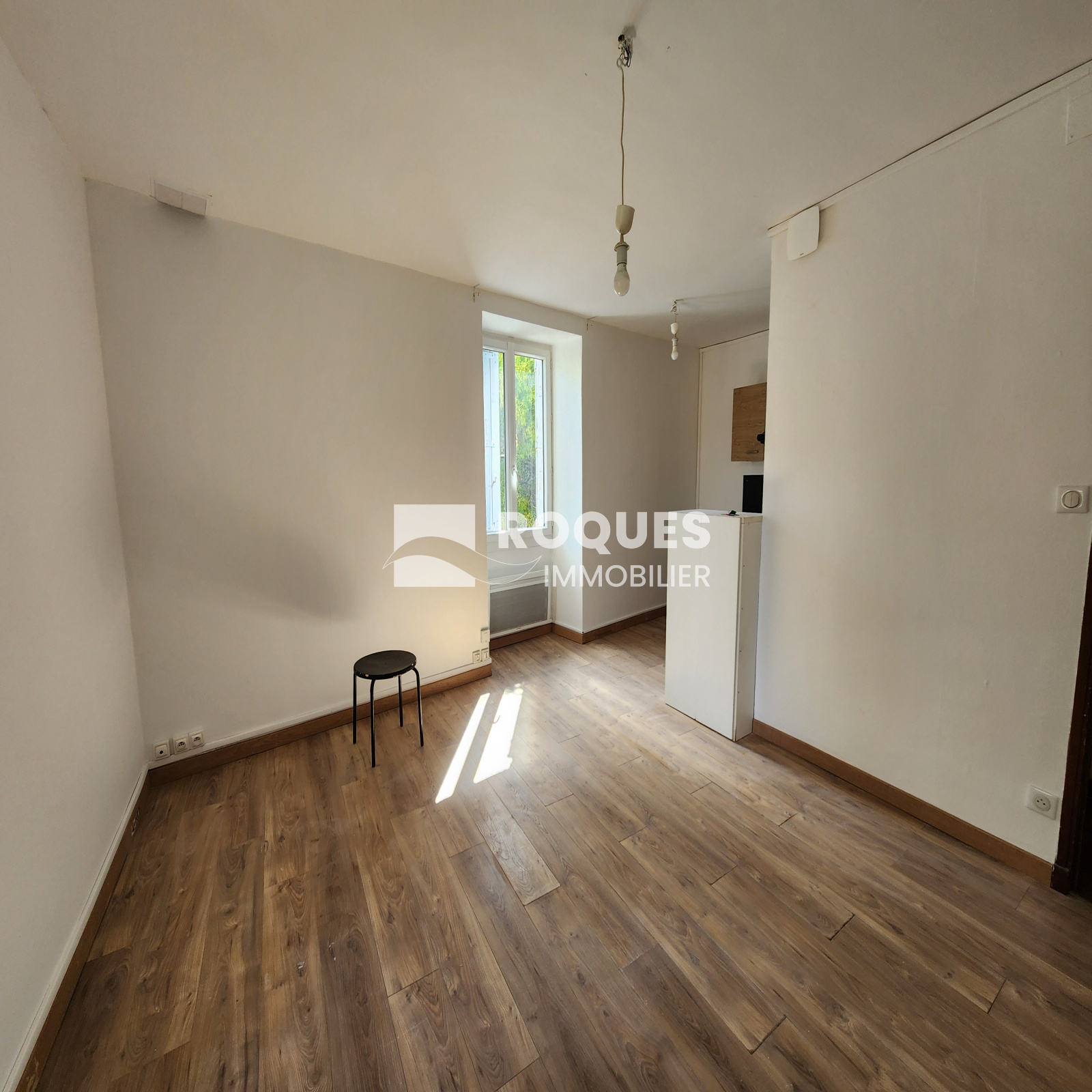Une pièce de vie avec cuisine, deux chambres, une salle d'eau, wc