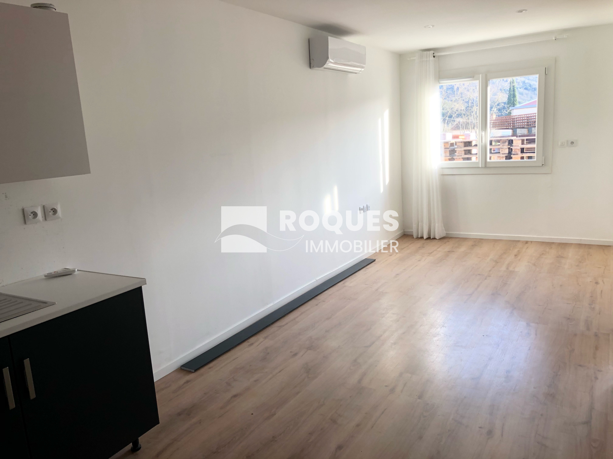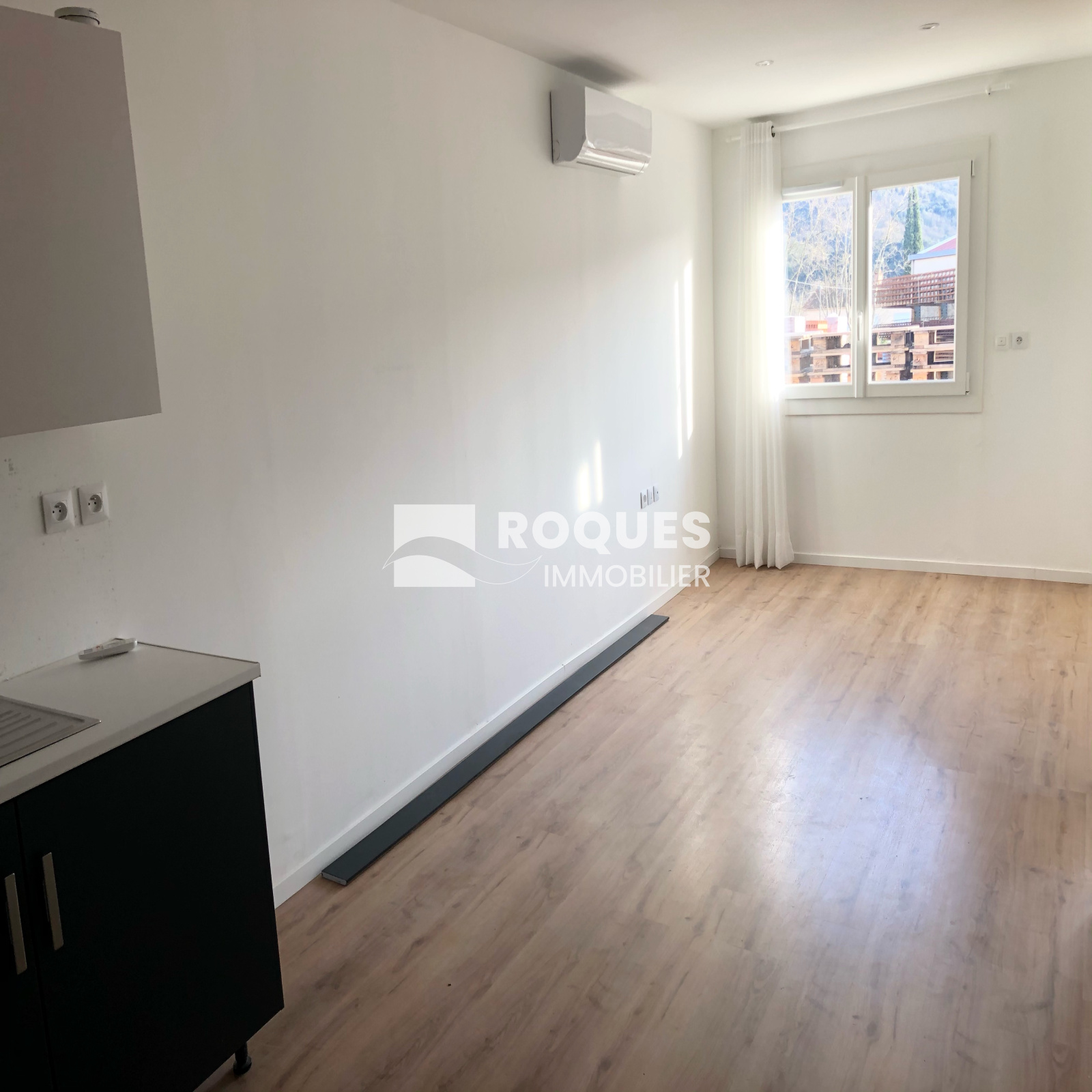 Cuisine équipée ouverte sur le séjour, chambre, salle d'eau avec toilette.