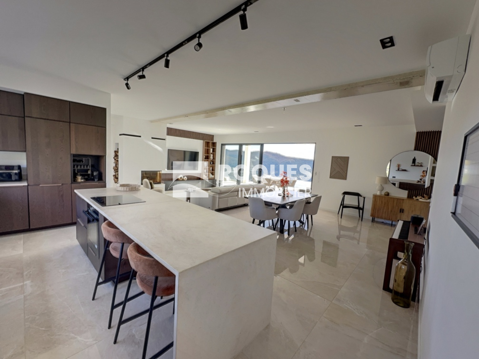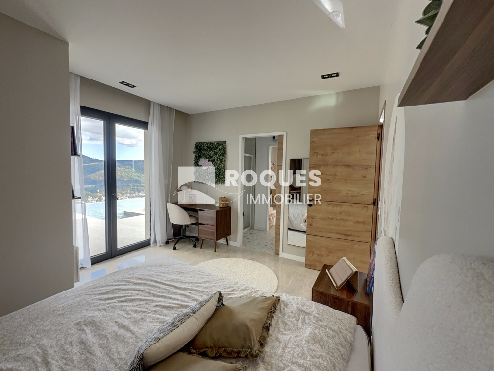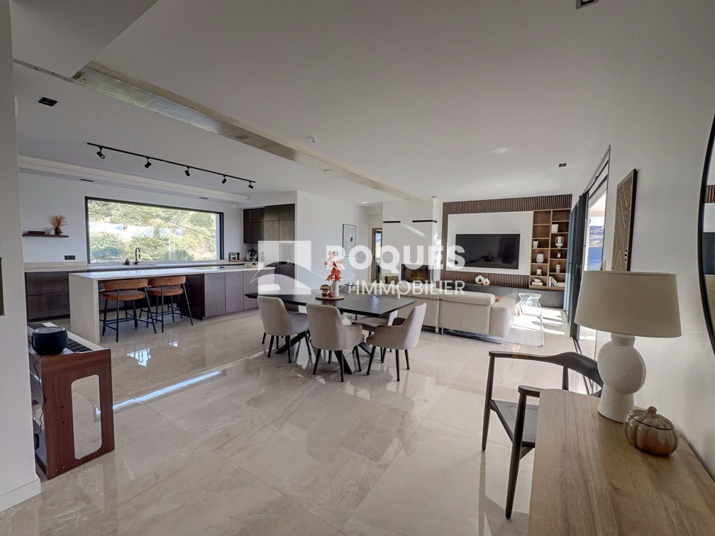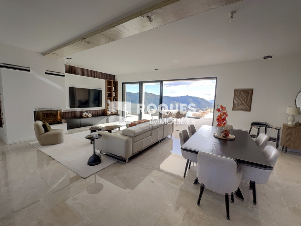 D'une surface habitable de 165 m², elle se compose d'un espace entrée, d'une spaciause pièce de vie de plus de 60 m² avec cuisine américaine entièrement équipée ouverte sur le vaste séjour lumineux, insert à bois et grande baie vitrée donnant sur une vue panoramique unique.