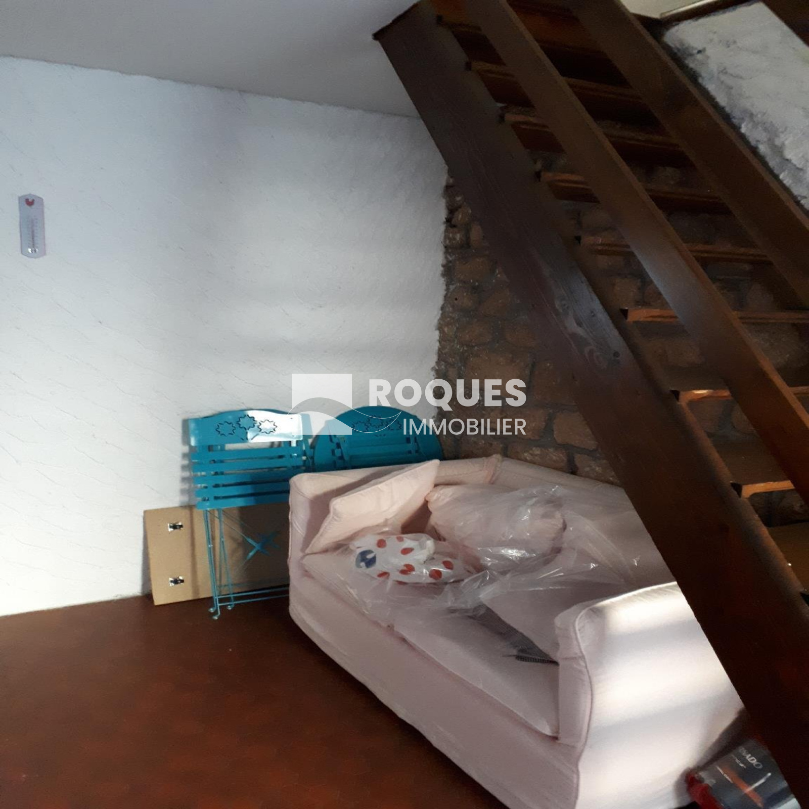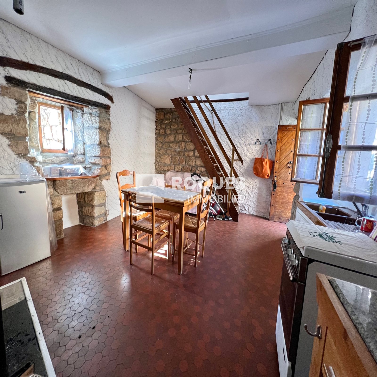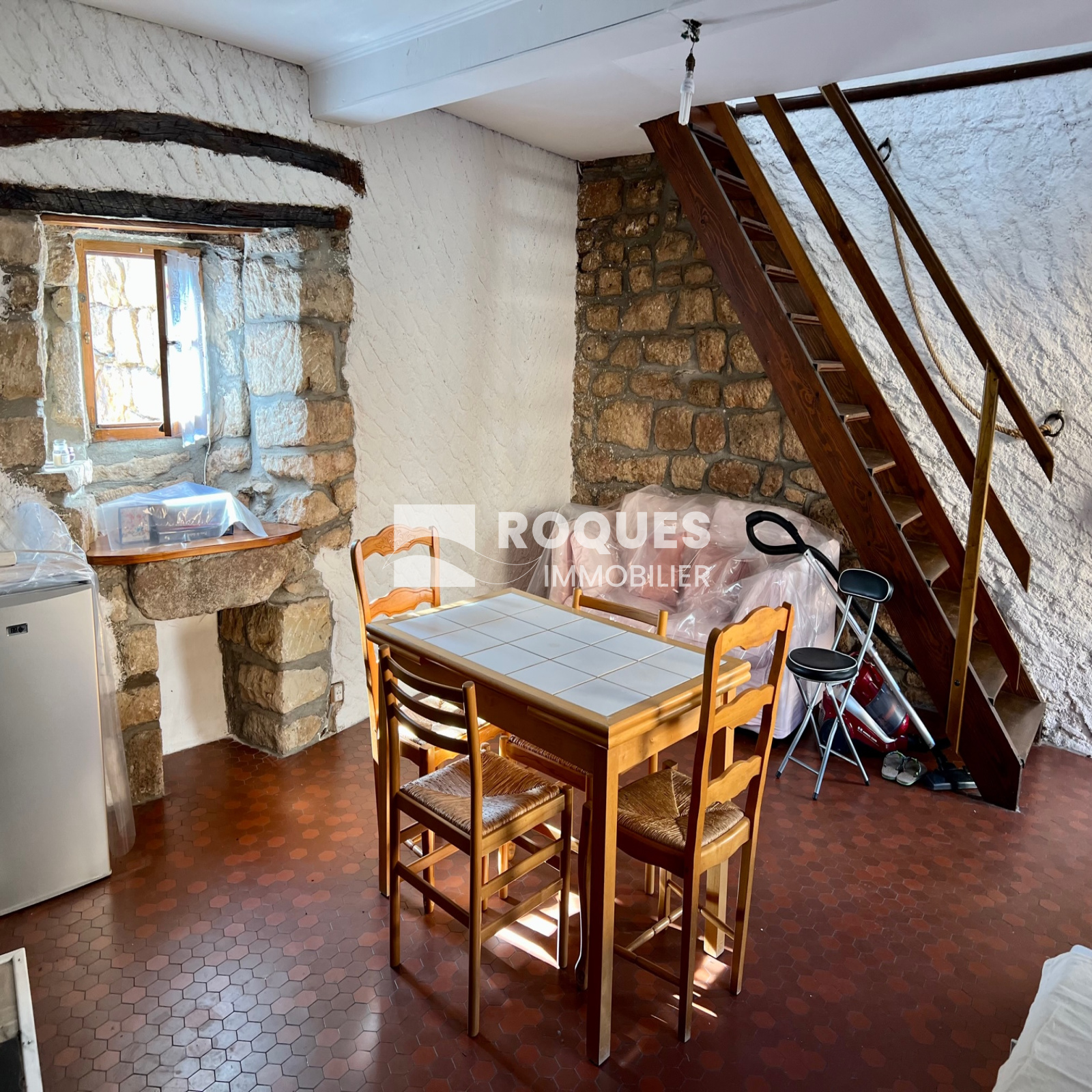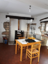 Elle dispose d'un séjour/cuisine avec un poêle à bois ainsi qu'une chambre mansardée à l'étage. Particularité, la salle d'au se trouve en rez de chaussée au niveau de la cave.