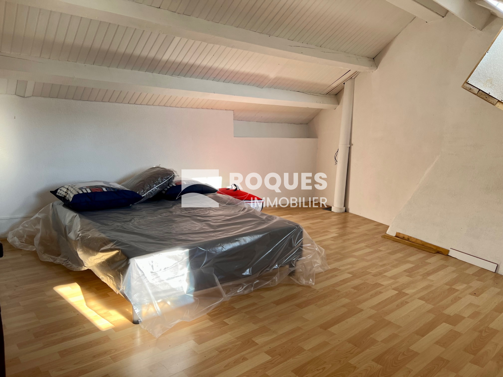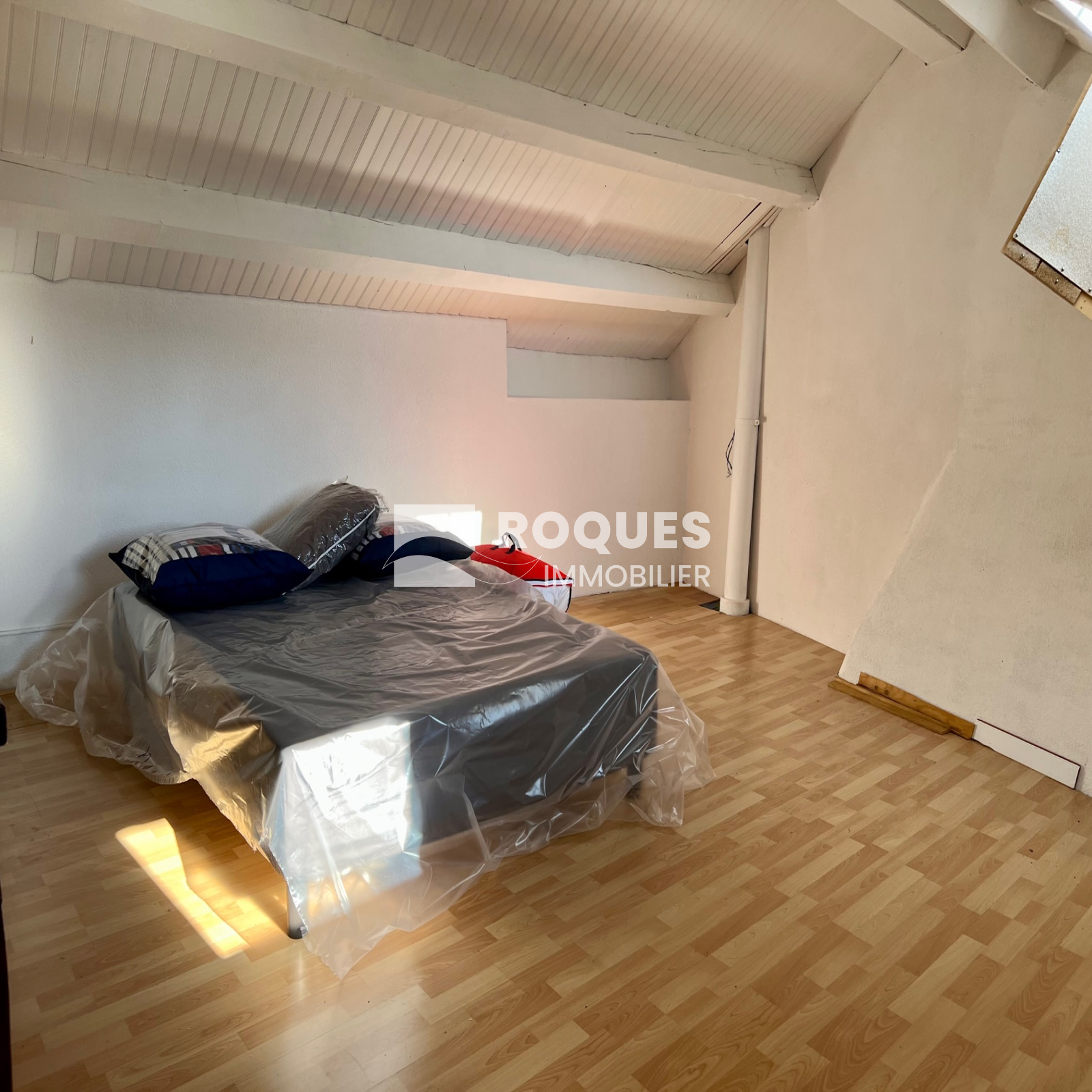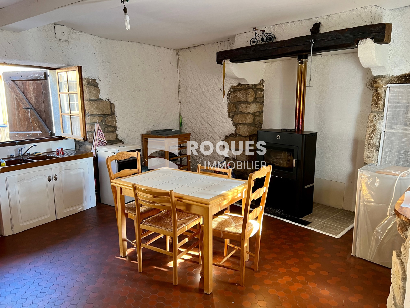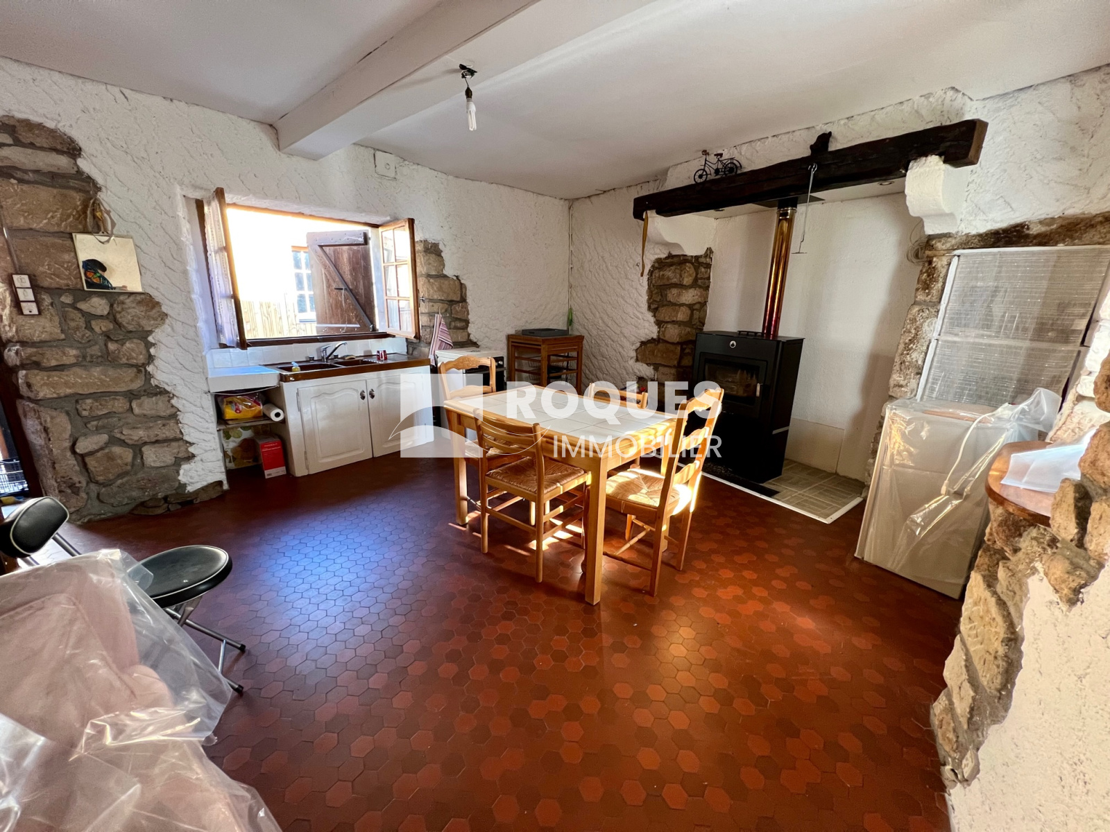 Elle dispose d'un séjour/cuisine avec un poêle à bois ainsi qu'une chambre mansardée à l'étage. Particularité, la salle d'au se trouve en rez de chaussée au niveau de la cave.