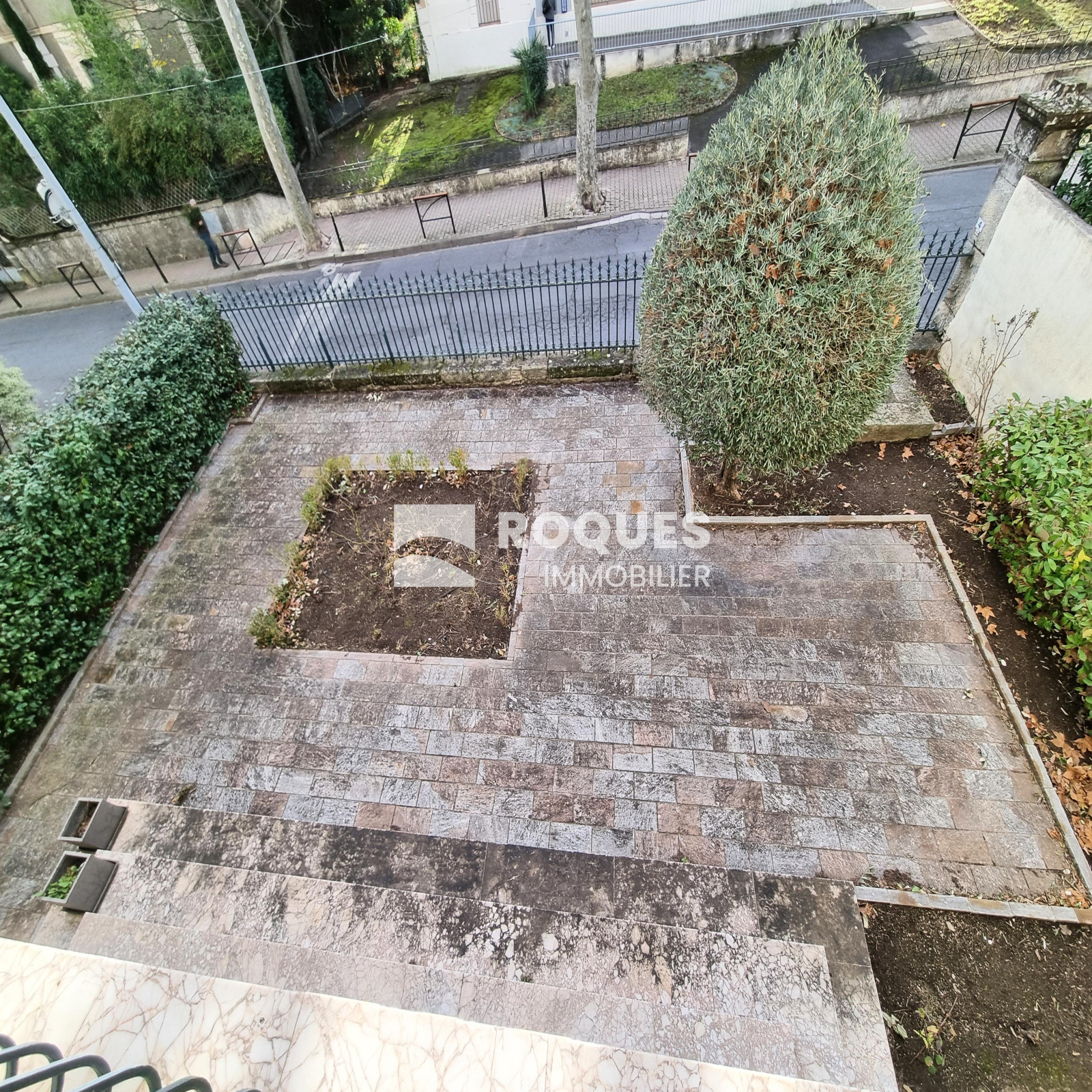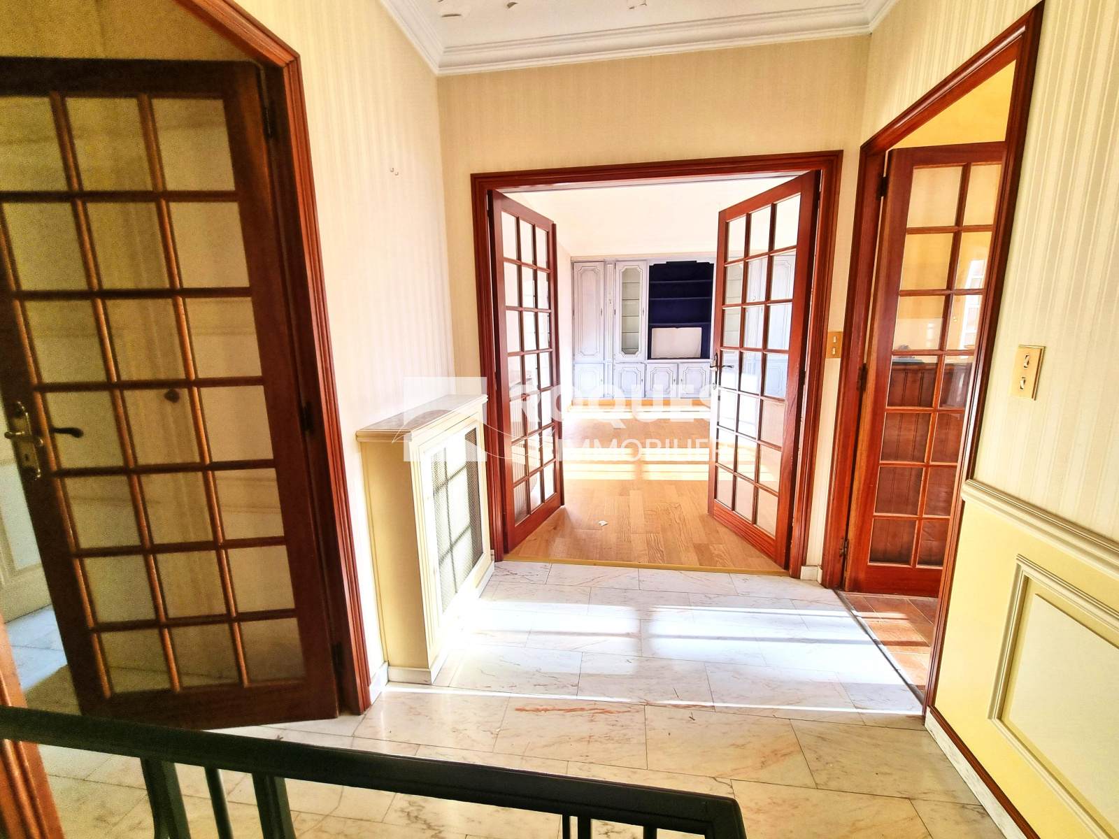 Aménagée sur deux niveaux, elle propose des espaces fonctionnels. Au rez-de-chaussée, un grand hall d’entrée agrémenté d’un élégant escalier en marbre blanc légèrement bleuté mène à deux pièces pouvant être aménagées en chambre, bureau..., ainsi qu’à une petite salle de bains avec toilettes. Quelques marches conduisent à l’arrière, où une grande pièce (pouvant servir de chambre ou encore de salon) et une buanderie-kitchenette s’ouvrent sur une cour pavée.