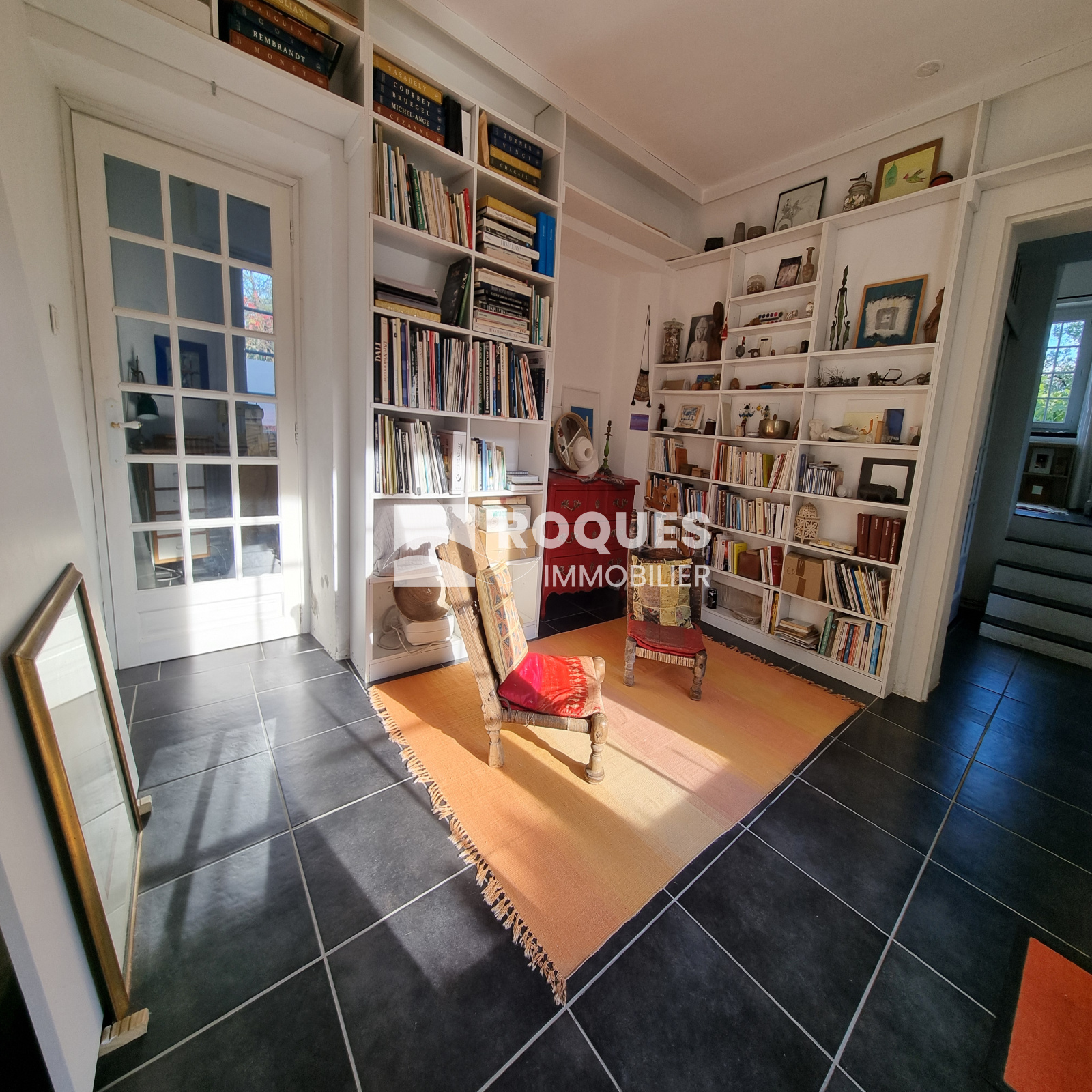 À l’étage, vous trouverez une salle d’eau avec douche à l’italienne et toilettes, suivi d'une buanderie et d'un grand dressing. Un couloir vous conduira ensuite sur une pièce aménagée en coin lecture avec bibliothèque donnant directement sur une seconde terrasse prolongée d'un joli jardin. Un coin nuit s’ajoute à cet étage avec une grande chambre et une autre pièce aménagée en chambre.