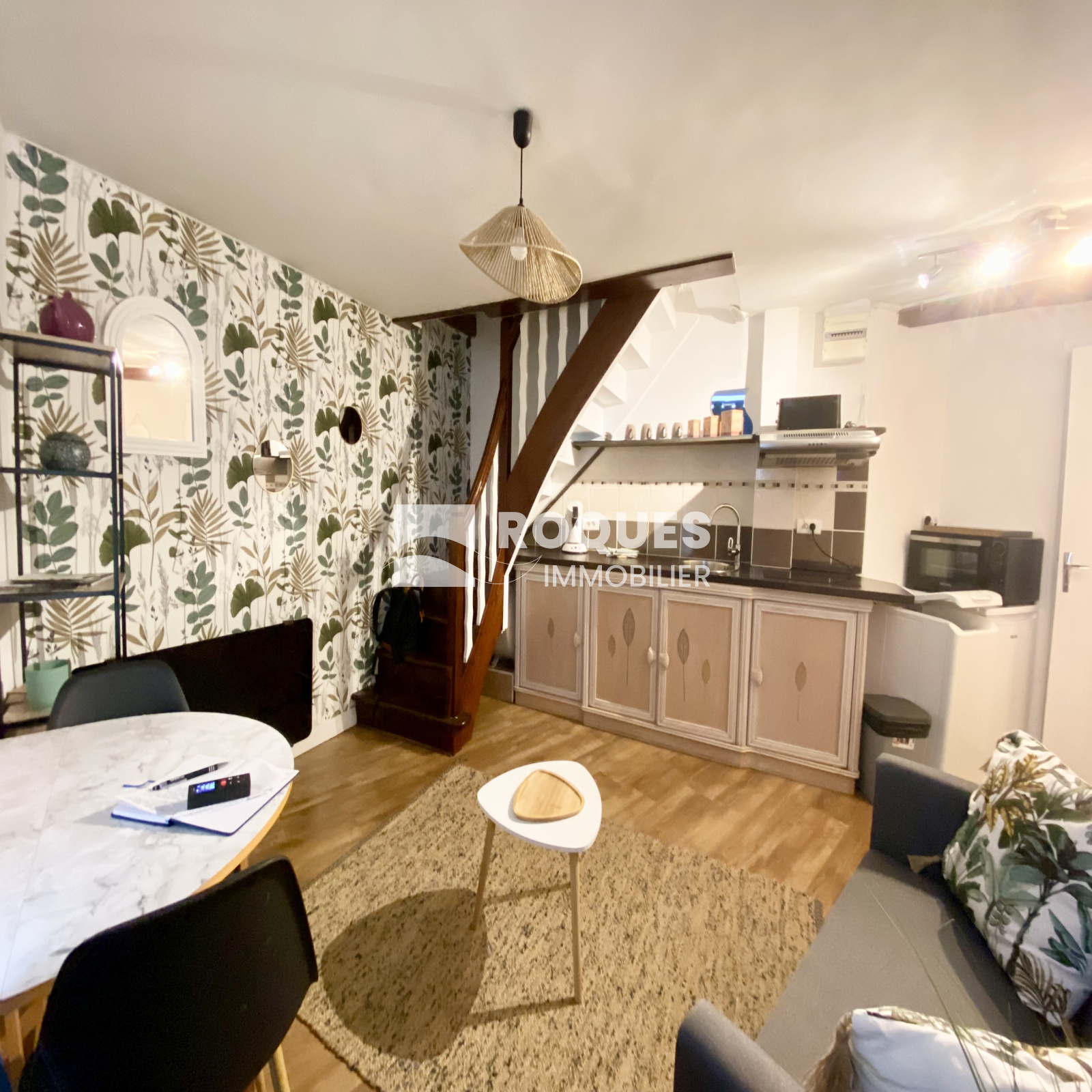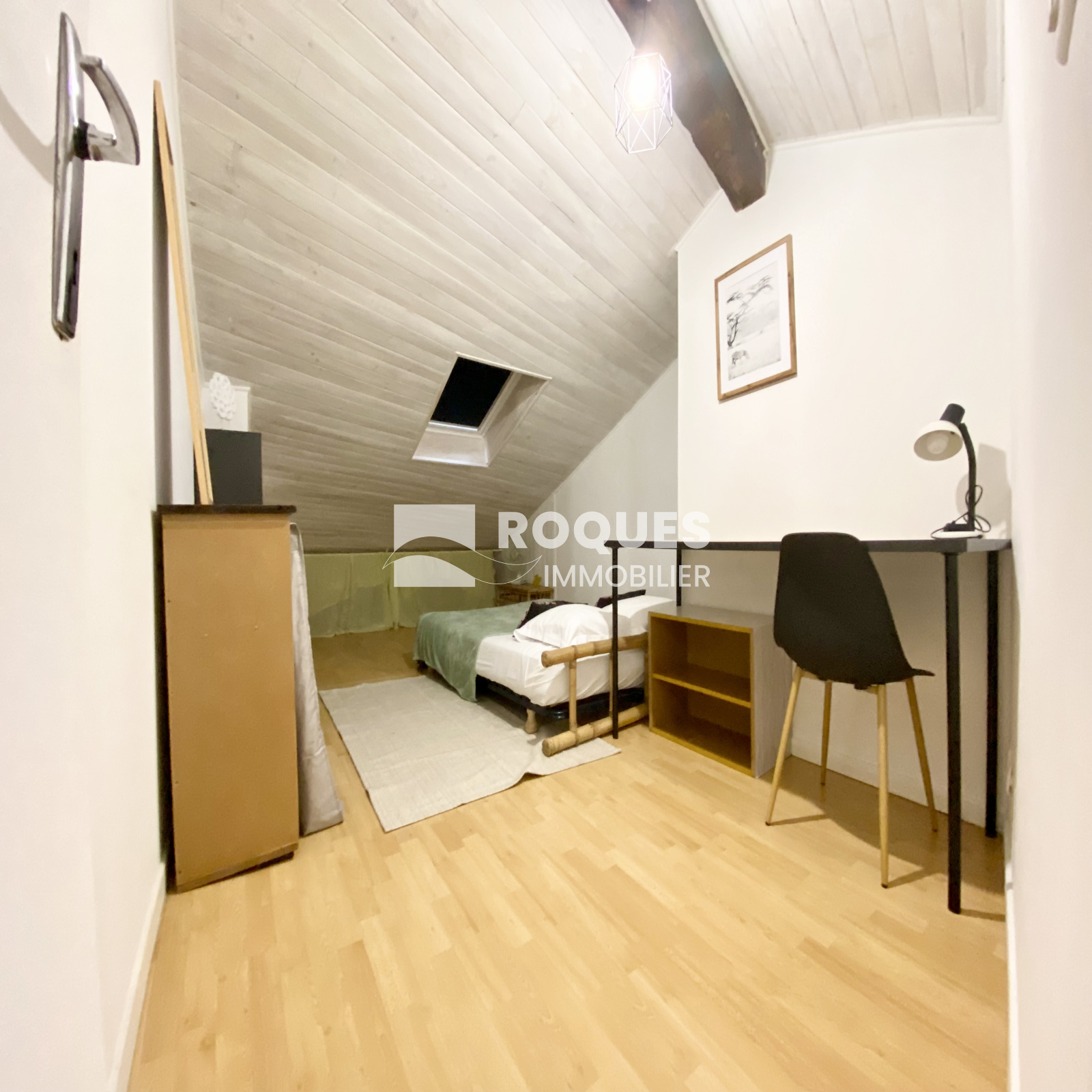 Il se compose d'une pièce à vivre de 15 m² au sol, d'une salle d'eau avec WC, à l'étage il dispose d'une mezzanine de 15 m² au sol et d'une chambre de 13 m² au sol mansardée.