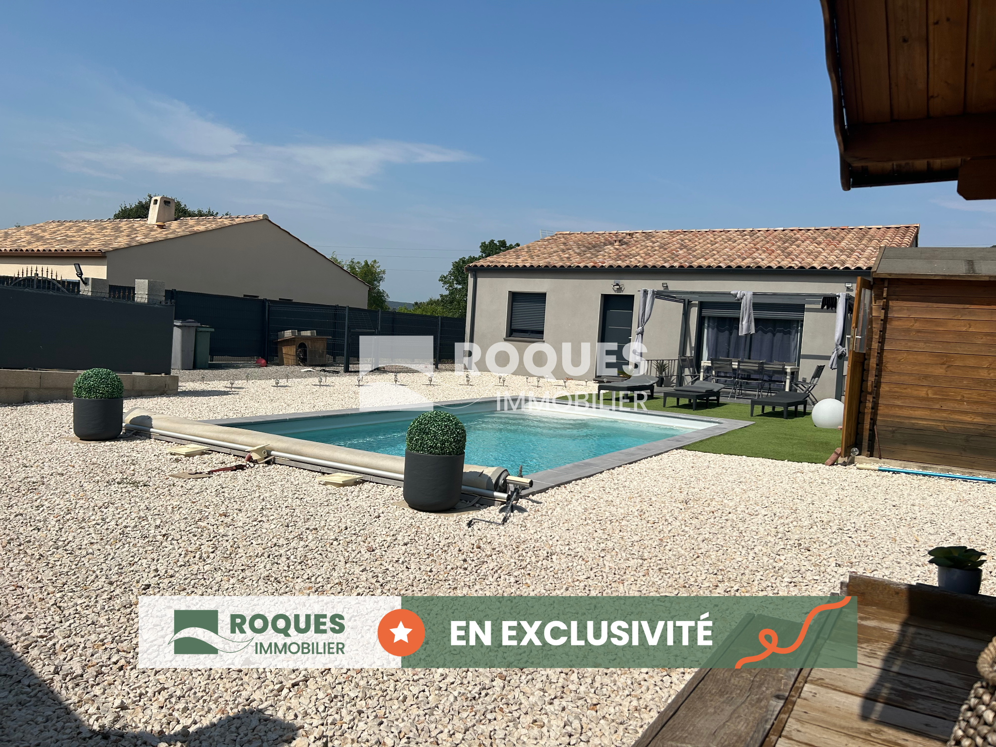 Extérieur: Terrasse arriere d'environ 38 m², cuisine d'été d'environ 14.5 m², Cellier clos de 10.5 m², une piscine 5.30 x 2.80m.